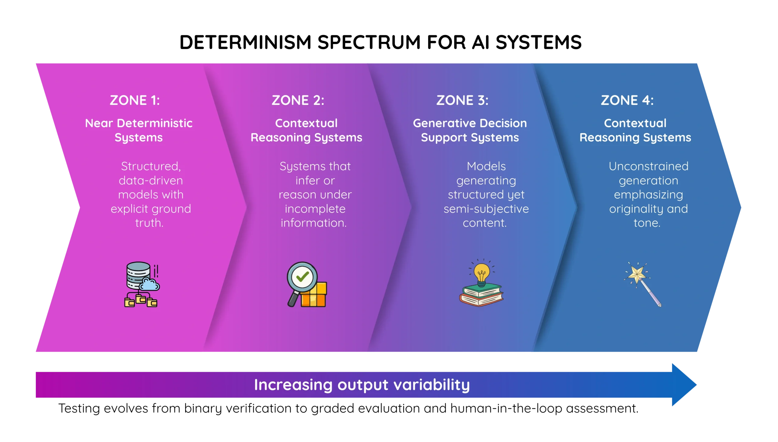 The Determinism Spectrum groups AI systems into four zones based on designed predictability. As you move from Zone 1 to Zone 4, predictability decreases, output variability increases, and human judgment becomes progressively more central to quality assessment: