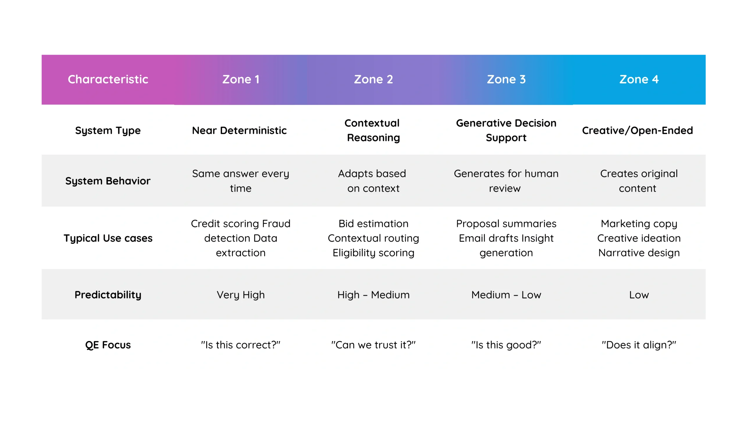 The key insight: Traditional QA was built for Zone 1 systems. As you move to Zone 2-4, you progressively require more specialized testing approaches.