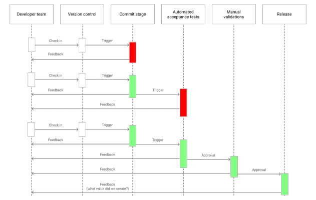 The following diagram shows an example of a simple linear deployment pipeline. In this example, green means no problems were found, and red means that one or more problems were discovered.